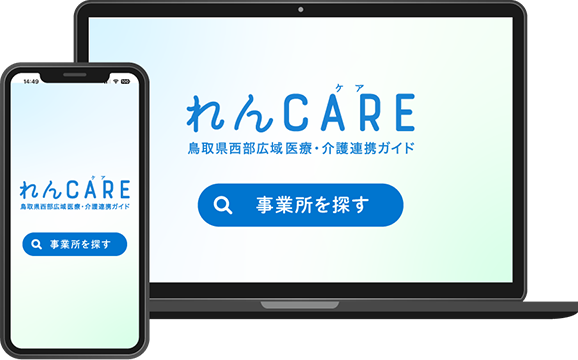 れんCAREは鳥取県西部の医療と介護を繋げるWebサービス。行政・病院・福祉施設・利用者が安心して連携できるように、必要な情報を掲載しています。